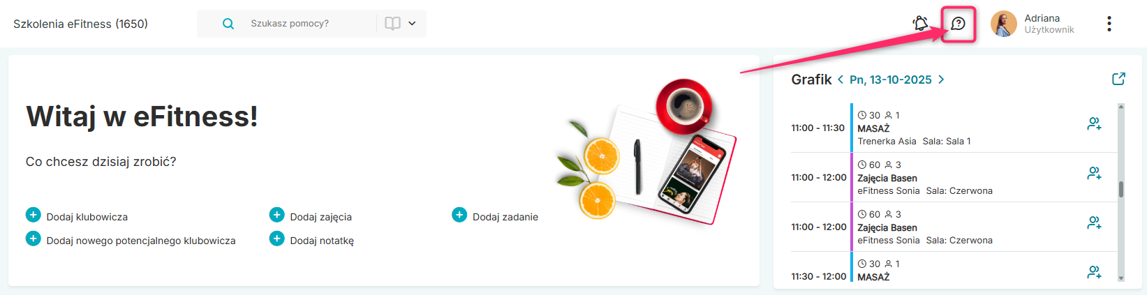 Za pomocą terminala możemy opłacić w systemie raty oraz zakupić produkty barowe. Domyślnie dostępna jest opcja opłacenia wyłączenie rat, więc jeżeli chcesz mieć możliwość płatności na terminalu przy sprzedaży barowej, napisz do nas zgłoszenie. W tym celu na górnej belce w systemie wybierz ikonę chmurki ze znakiem zapytania –> przycisk „Napisz do nas”:
