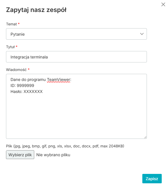 W treści zgłoszenia prześlij dane do połączenia zdalnego z aplikacji TeamViewer: