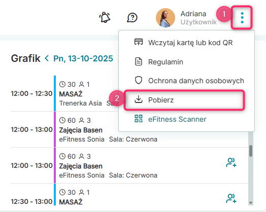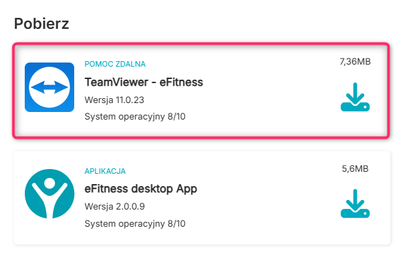 Jeżeli nie posiadasz zainstalowanej aplikacji TeamViewer, możesz ją pobrać z poziomu systemu eFitness. W prawym górnym rogu wybierz ikonę trzech kropek -> Pobierz: