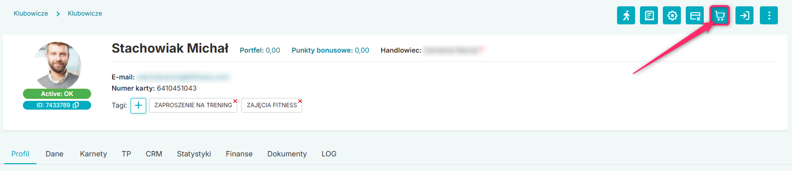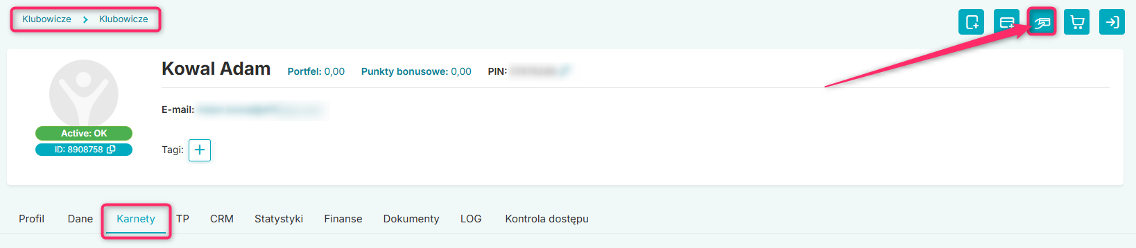 W celu opłacenia rat przejdź na profil Klubowicza, a następnie do zakładki Karnety. Kliknij w ikonę dłoni z kartą w prawym górnym rogu: