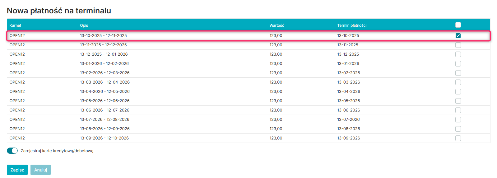 Wyświetlą się wówczas wszystkie raty aktywnego karnetu. Wybierz które mają zostać opłacone: