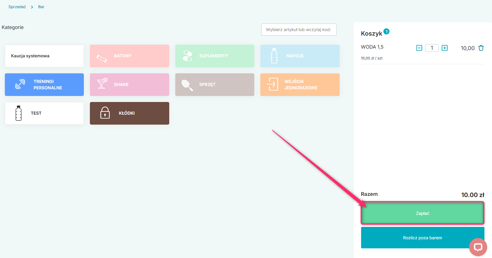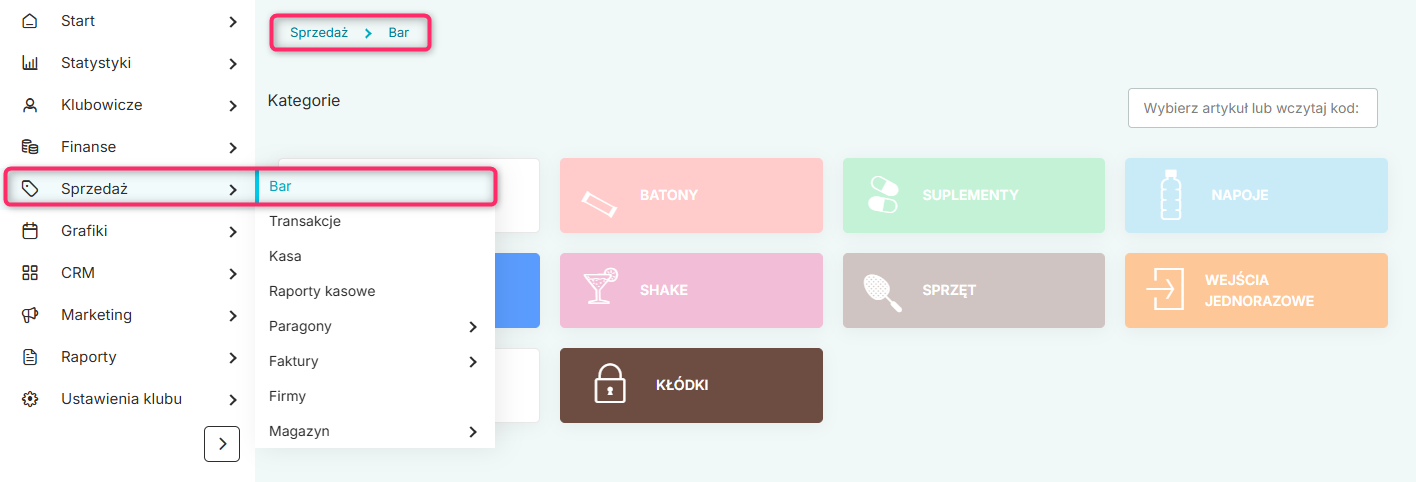 W przypadku sprzedaży barowej, jeśli płatność ma się odbyć przez terminal, przejdź do zakładki Sprzedaż -> Bar lub na profil Klubowicza -> ikona kosza zakupowego w prawym górnym rogu.