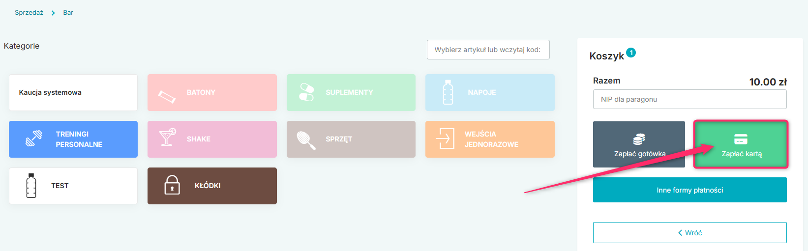 Ważne! Po zintegrowaniu terminala z systemem eFitness i włączeniu opcji płatności terminalem za produkty barowe przycisk „Zapłać kartą” zawsze będzie się wiązał z dokonaniem płatności na terminalu.