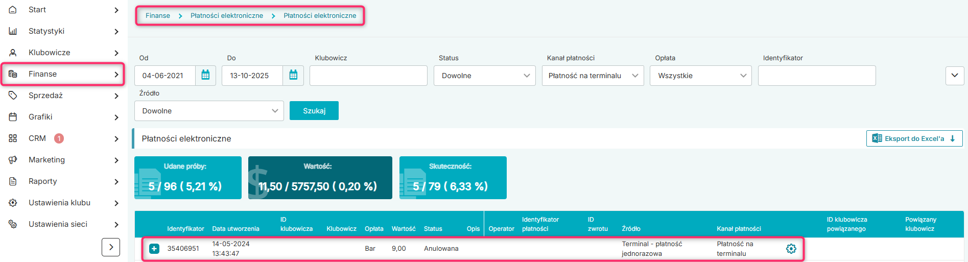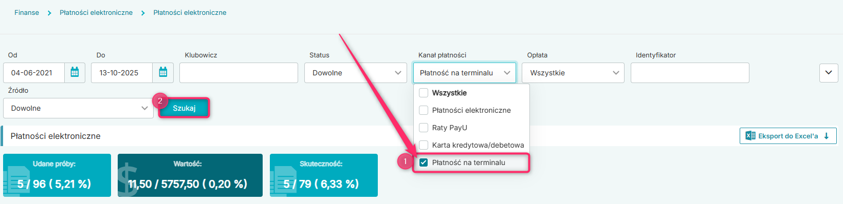 Jeżeli chcesz sprawdzić wyłącznie płatności dokonane za pomocą terminala, w filtrze „Kanał płatności” wybierz „Płatność na terminalu” i kliknij w przycisk „Szukaj”: