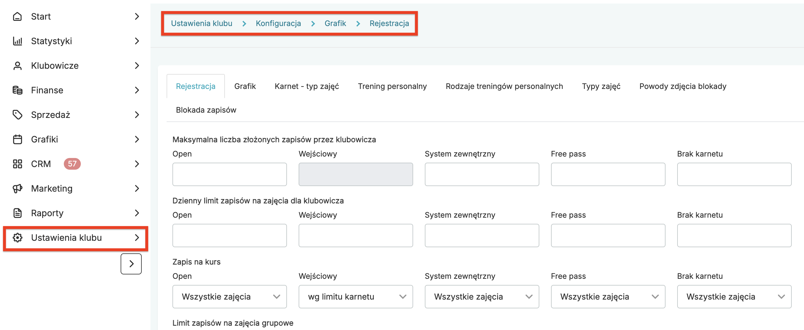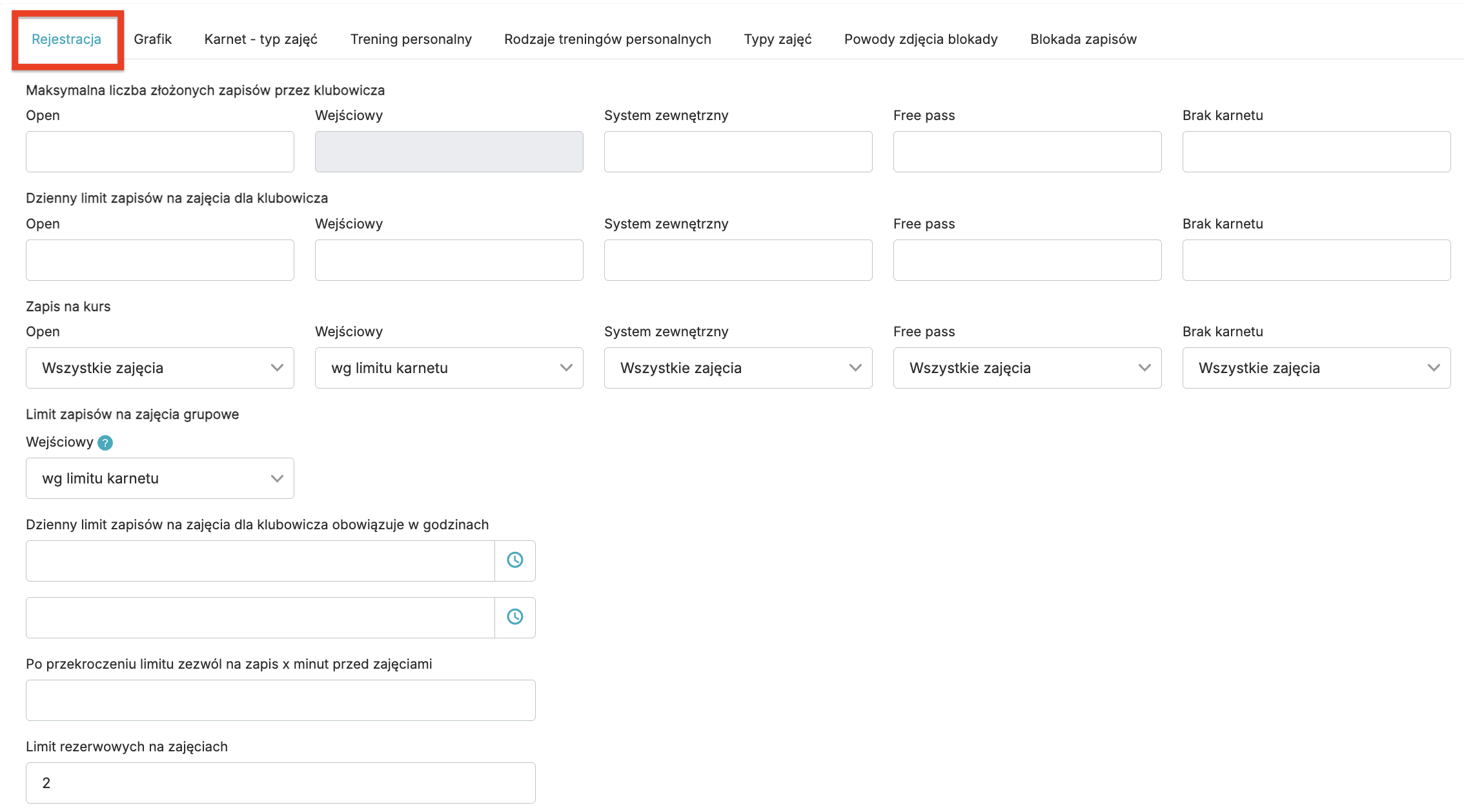 • Limit zapisów na zajęcia grupowe – określ jaki limit zapisów na zajęcia obowiązuje przy karnetach wejściowych. Są dwie opcje do wyboru: