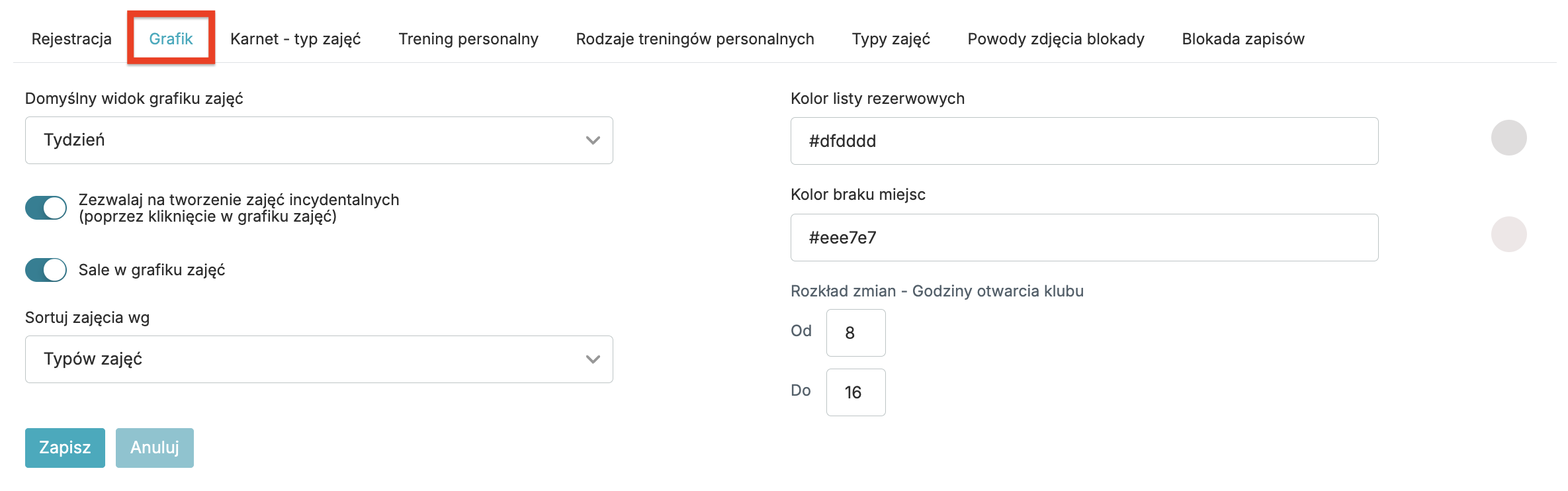 • Kolor listy rezerwowych – wybierz kolor jakim będą oznaczone zajęcia w grafiku w systemie, jeśli będzie lista rezerwowa.