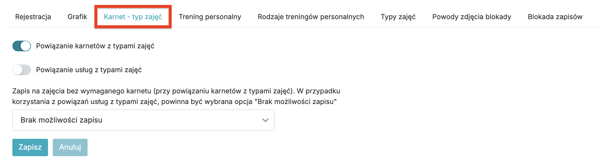 • Zapis na zajęcia bez wymaganego karnetu – opcja związana z powyżej opisanym powiązaniem. Wybierz jedną z opcji: