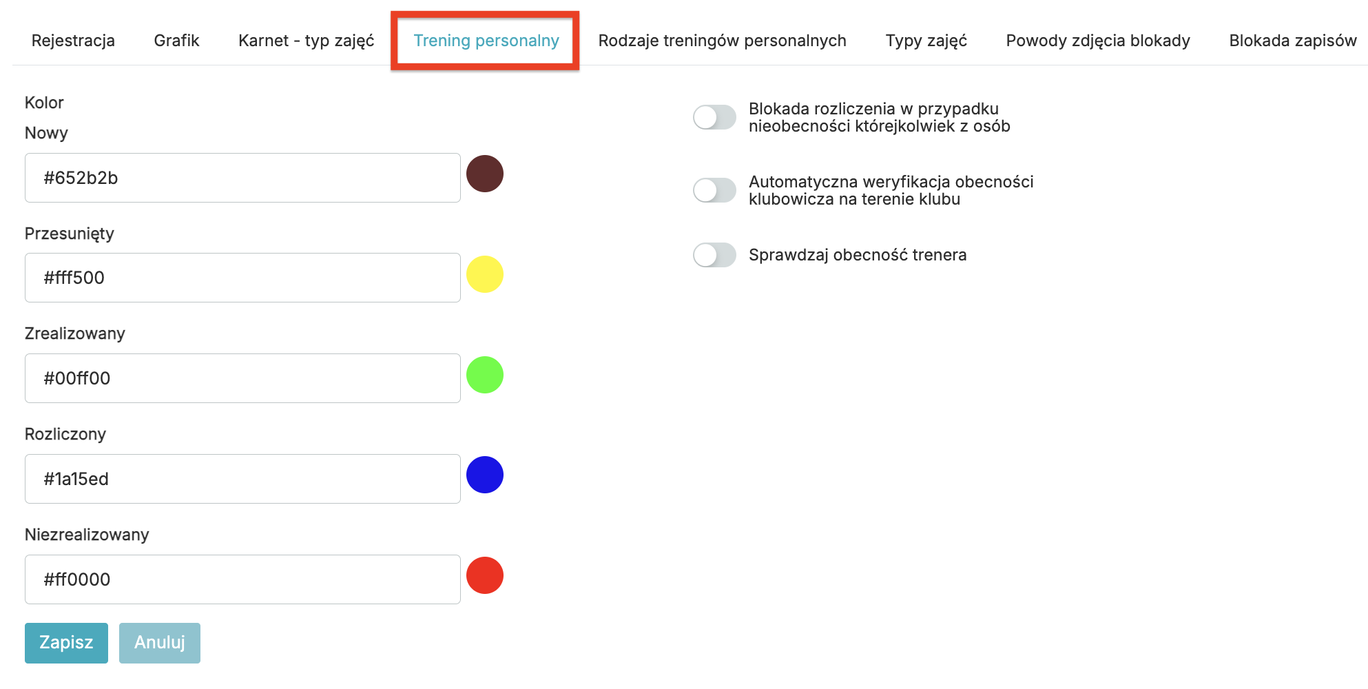• Kolor – zdefiniuj kolory statusów treningu personalnego. Kolory te są wyświetlane w zakładce Grafiki > TP.