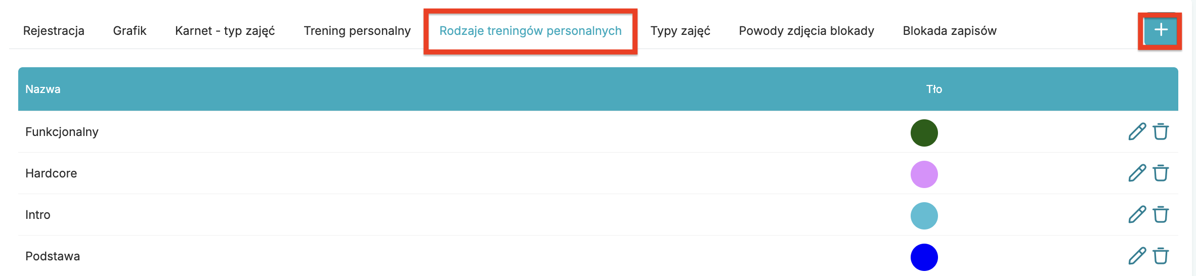 Ikoną plusa dodaj rodzaje treningów personalnych, które będą dostępne do wyboru przy dodawaniu treningów w zakładce Grafiki > TP.