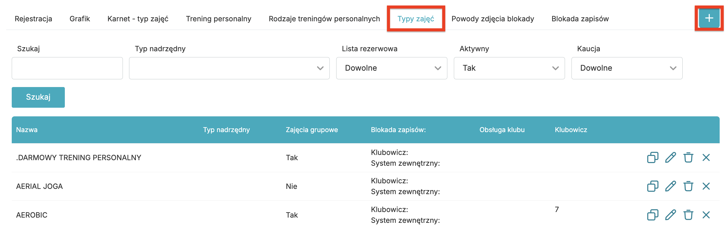 Pamiętaj, że po utworzeniu danego typu zajęć możesz go skopiować za pomocą ikony dwóch kwadracików. Pozwala to na szybsze tworzenie typów zajęć.