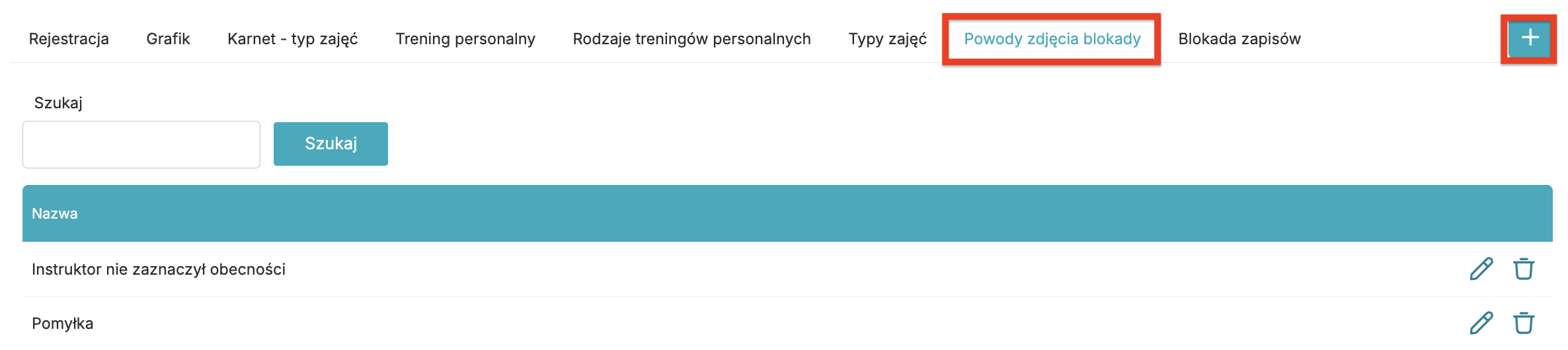 Ikoną plusa zdefiniuj powody, które można wybrać podczas zdejmowania blokady zapisów na profilu Klubowicza. Podanie powodu jest obowiązkowe.