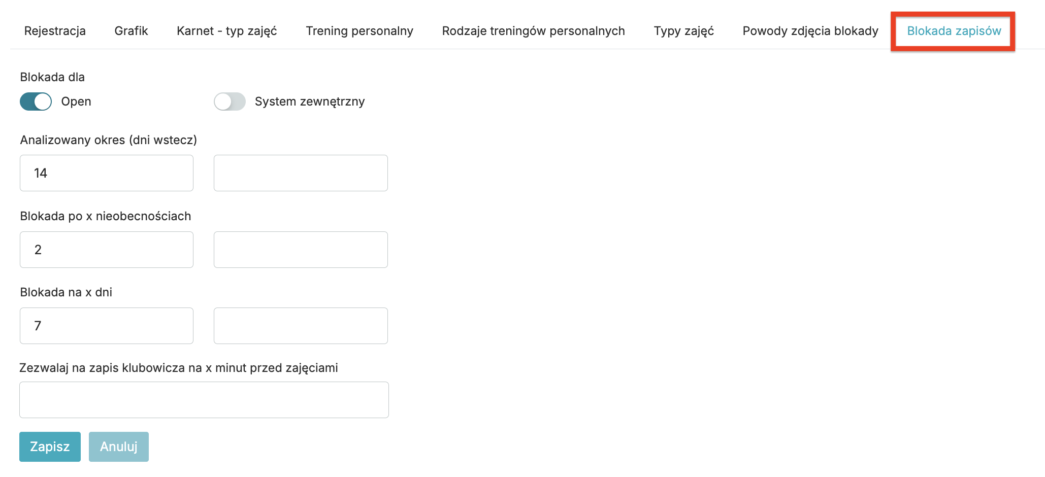 Blokada zapisów na zajęcia może być nakładana automatycznie dla karnetów typu open, bezterminowych oraz z formą płatności system zewnętrzny (suwak System zewnętrzny).