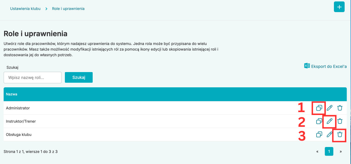 Domyślnie, w systemie, możemy znaleźć trzy przygotowane przez nas role – Administrator, Obsługa klubu i Instruktor. Te role są stworzone przez nas automatycznie i są w pełni edytowalne.