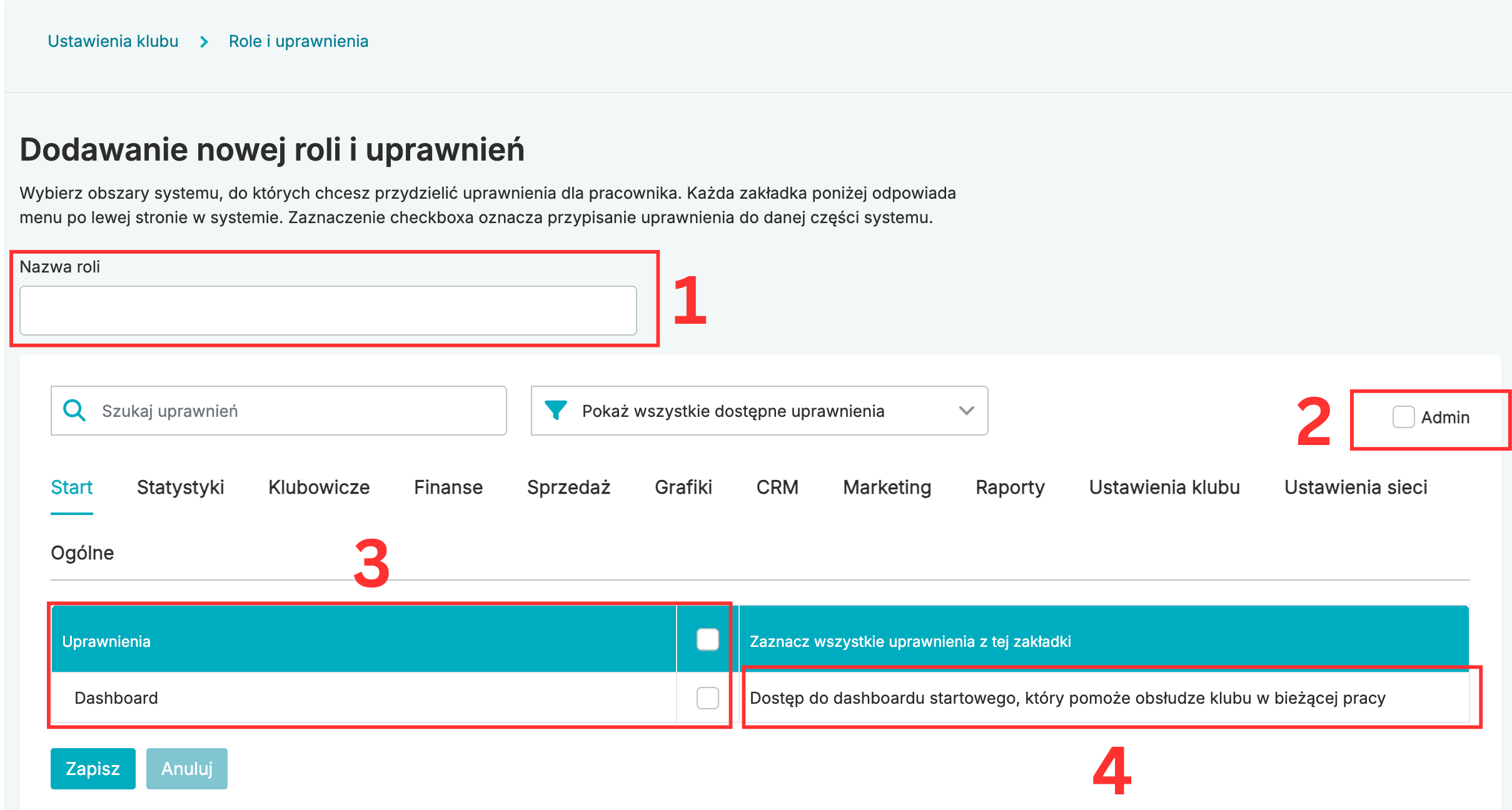 Rola jest zdefiniowanym zbiorem nadanych uprawnień, służących do poruszania się po systemie. Uprawnienia dotyczą widoczności zakładek, jak i dostępność danych opcji dla pracownika. Zarządzanie i edycja ról jest dostępna w zakładce Ustawienia klubu > Role i uprawnienia