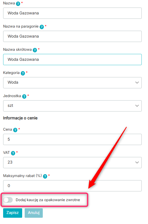 3. Włącz suwak „Dodaj kaucję za opakowanie zwrotne”