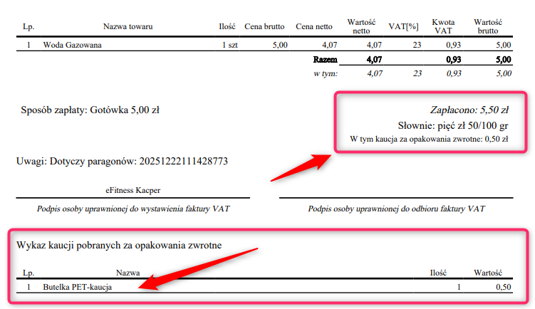 W przypadku sprzedaży produktów objętych kaucją, na fakturze widoczna jest informacja o doliczonej kwocie kaucji. Kwota „Razem” / „Do zapłaty” uwzględnia wartość pobranej kaucji. Dodatkowo na dokumencie wyświetlana jest osobna sekcja dotycząca pobranych kaucji, prezentowana w formie tabeli w dolnej części faktury.